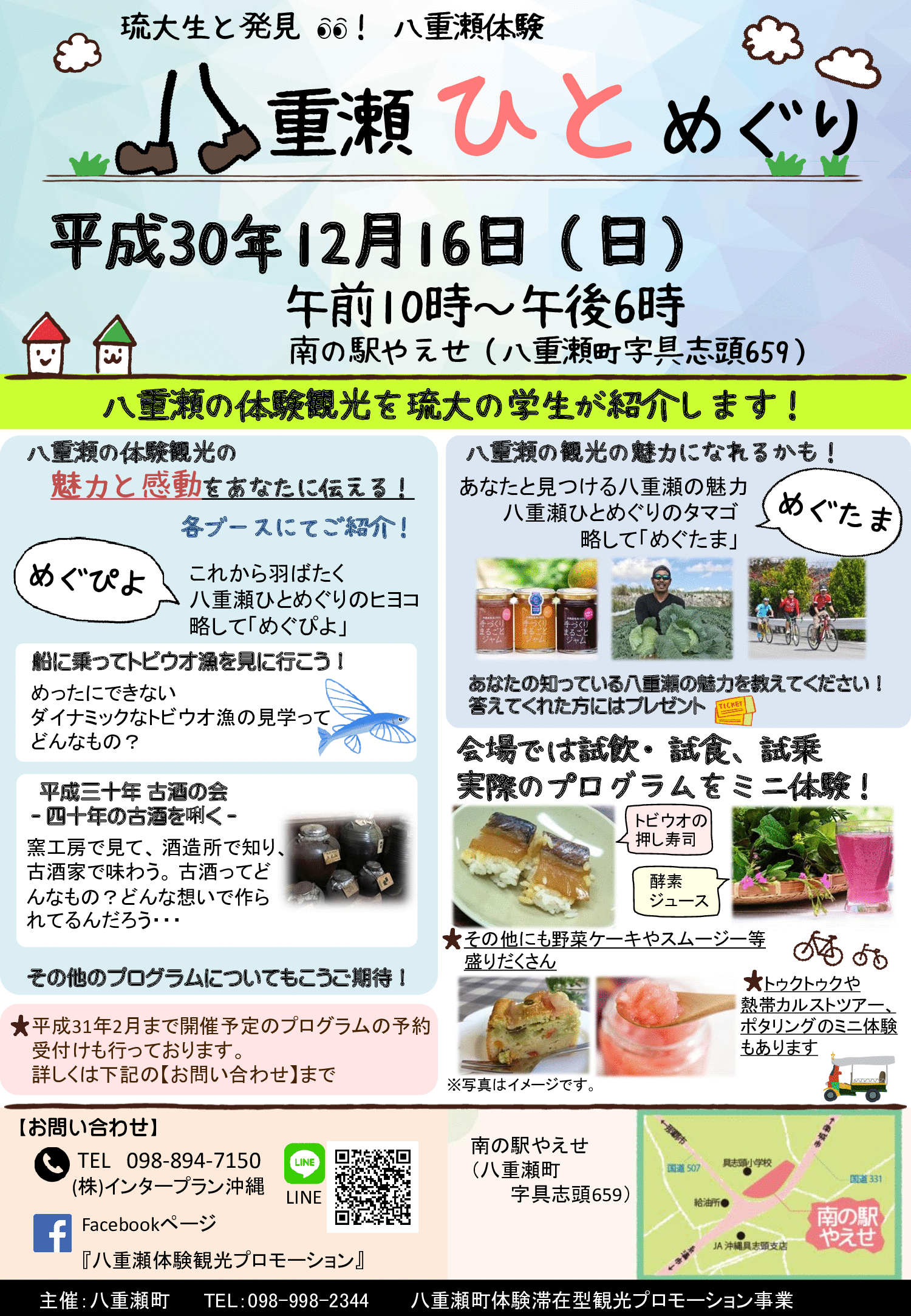 地域の「くらし体験」に着目し、八重瀬町の地域資源を魅力ある観光資源として来町者へ提供するため、地域資源の調査と発掘を行い、体験プログラムの作成とモニタリングを実施しました。さらに、地域と事業者と行政が協働で観光客を迎え入れるための体制について検証を行い、顕在化した課題に対して解決策または軽減策を講じることにより、持続的な観光基盤の構築と地域の活性化を図りました。